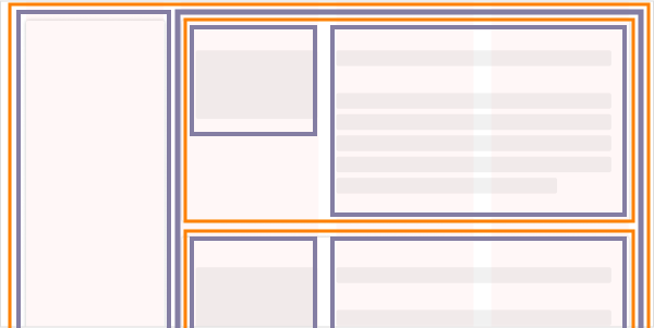 Grid items are a concept specific to Kolibri's grid system, based loosely on the same concept from CSS grids. Grid items represent a group of content that should expand and contract together as sizes and contents change. Below, there is a single-column grid item on the far left. Inside each page container on the right, there is a single-column grid item on the left and a two-column grid item on the right: