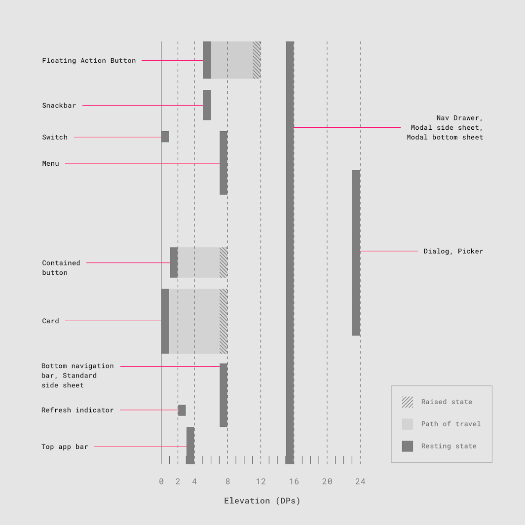 - cards, app bars, buttons, menu, tooltips, snackbars